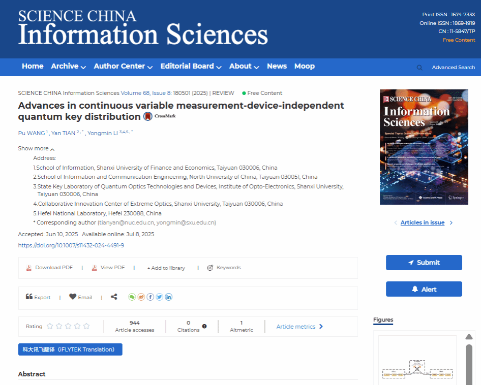 近期,学院青年教师王普博士的研究成果“Advances in continuous variable measurement-device-independent quantum key distribution”在《中国科学:信息科学》2025年第8期(Science China Information Sciences, 2025, 68(8), 180501)上发表,该期刊系我校认定的AI级学术刊物。山西财经大学信息学院为该论文的第一署名单位,王普为第一作者。此项研究工作得到了国家自然科学基金、量子科技创新专项、山西省基础研究计划以及山西省高等学校科技创新项目的联合支持。