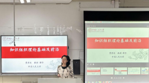 讲座第一部分为知识组的理论基础。贾君枝教授从20世纪30年代英国编目专家布里斯首次提出知识组织的概念切入,系统回顾了知识组织的理论基础,以及历经的文献组织阶段、网络资源组织阶段以及知识组织阶段历程。随后,向师生分享了知识组织的本质、核心构成要素以及知识组织系统的概念、内涵、类型等。第二部分为知识组织的语义化发展,包括对语义网、RDF(资源描述框架)、知识图谱相关内容的分享。第三部分为讲座重点,即知识组织的智能化发展,主要介绍了深度学习算法在知识组织系统构建中的应用、主题标引设计算法以及人工智能模型在知识组织中的应用等问题。