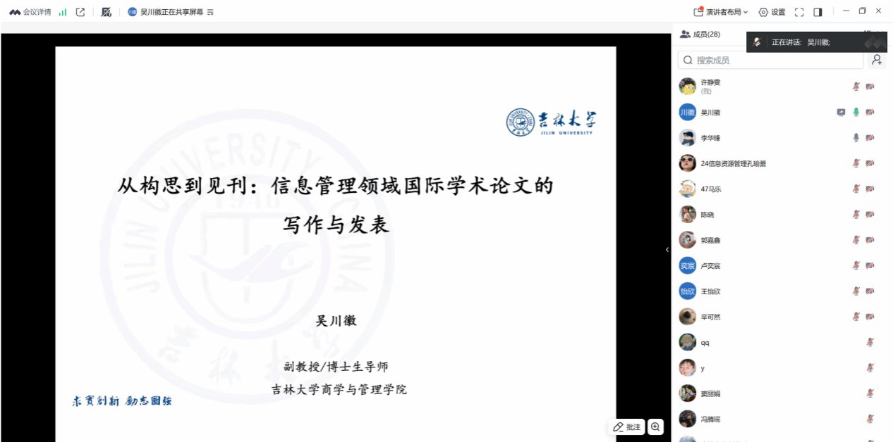 山西财经大学“信息资源管理一级学科·一流学者100分钟系列讲坛”第25期于2025年12月10日晚通过腾讯会议平台顺利举办。本期讲座特邀吉林大学商学与管理学院副教授、博士生导师吴川徽博士担任主讲嘉宾,由信息学院李华锋副教授主持。